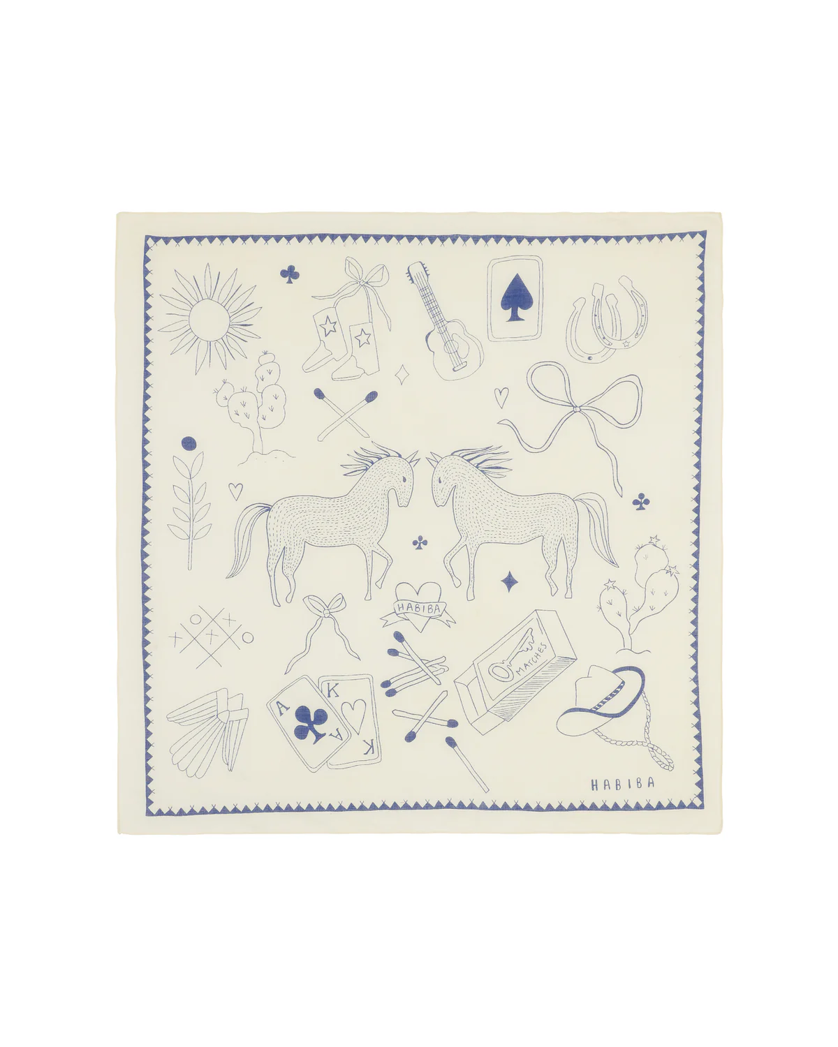Inspireret af det vilde vestens ånd fortæller denne håndtegnede bandana en samling af finurlige små historier. Med indviklede illustrationer, et unikt kantmønster og et håndtegnet logo føles den dybt personlig – fremstillet med kærlighed fra HABIBA.