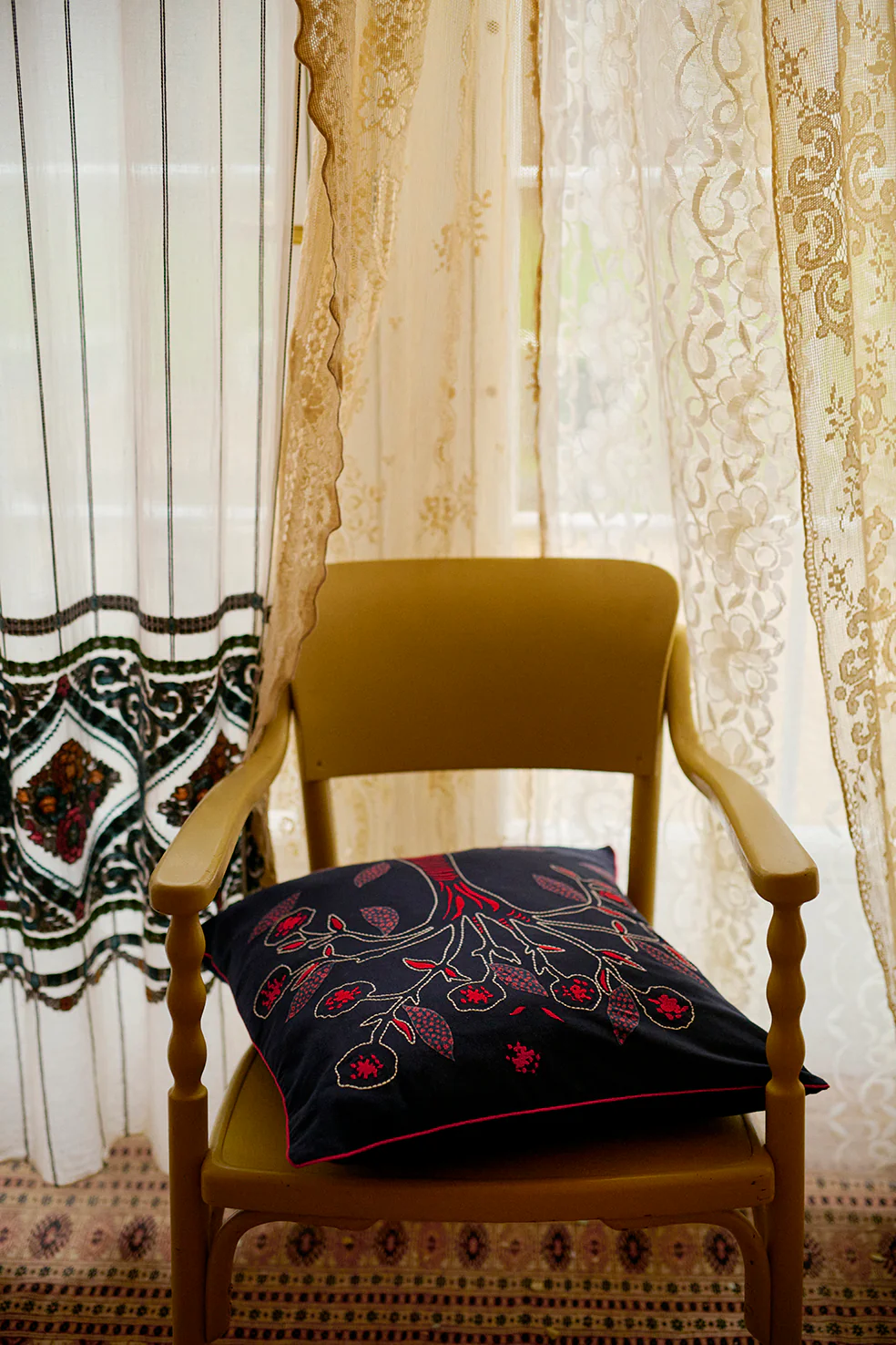 Pude med et smukt miks af broderi og patchwork.