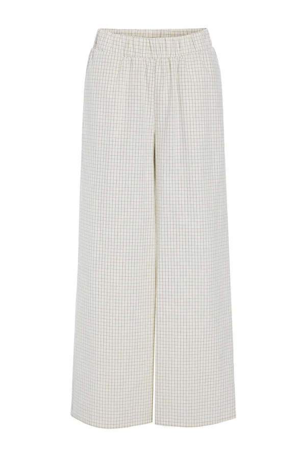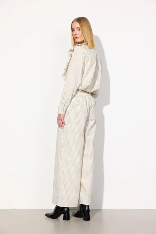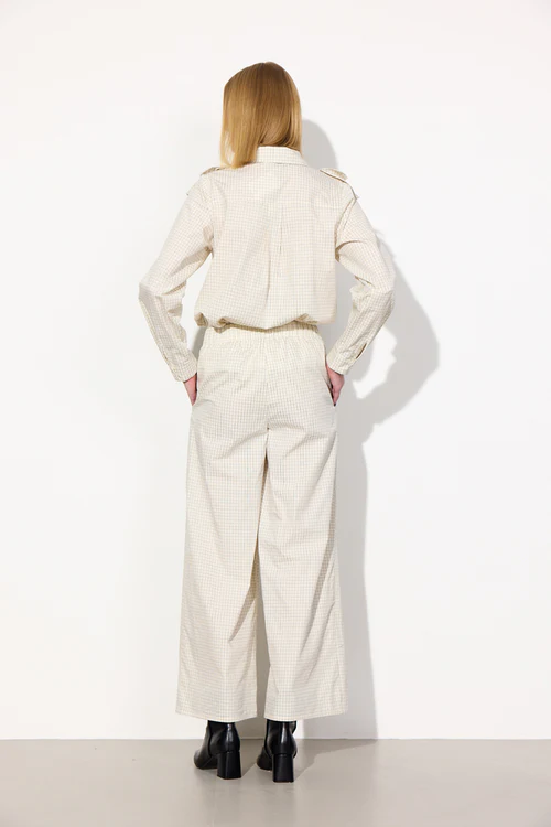 De har skrå sidelommer og er lavet i en blød bomuld med et fint ternet mønster.