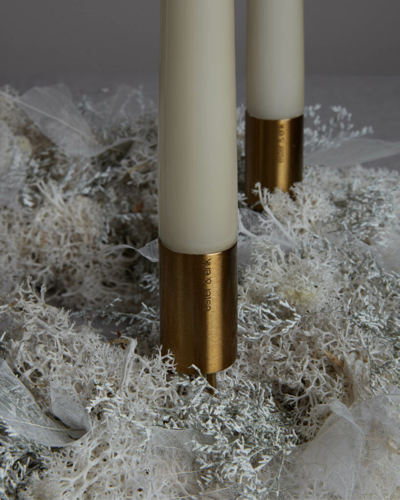 De elegante lysesticks står lysene i dine dekorationer pænt og stabilt og har tre spyd på seks centimeter, der sikrer, at lysene står sikkert. Designet er simpelt og elegant med et diskret ester & erik-logo.