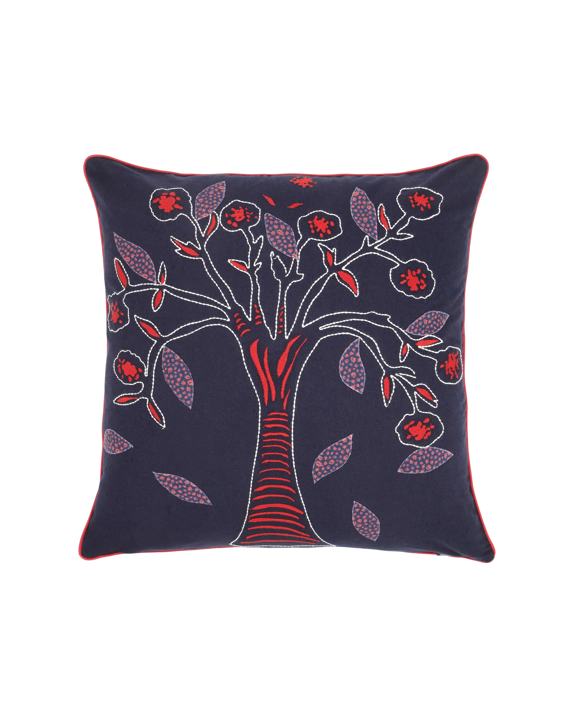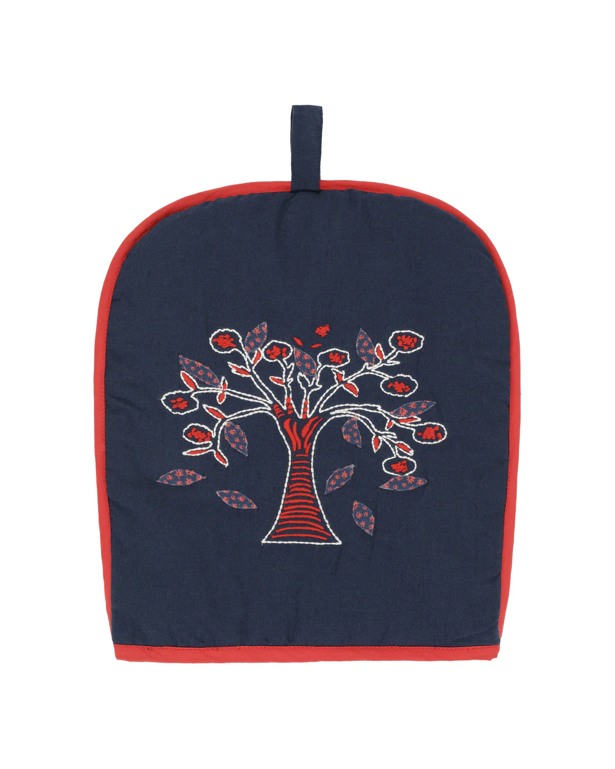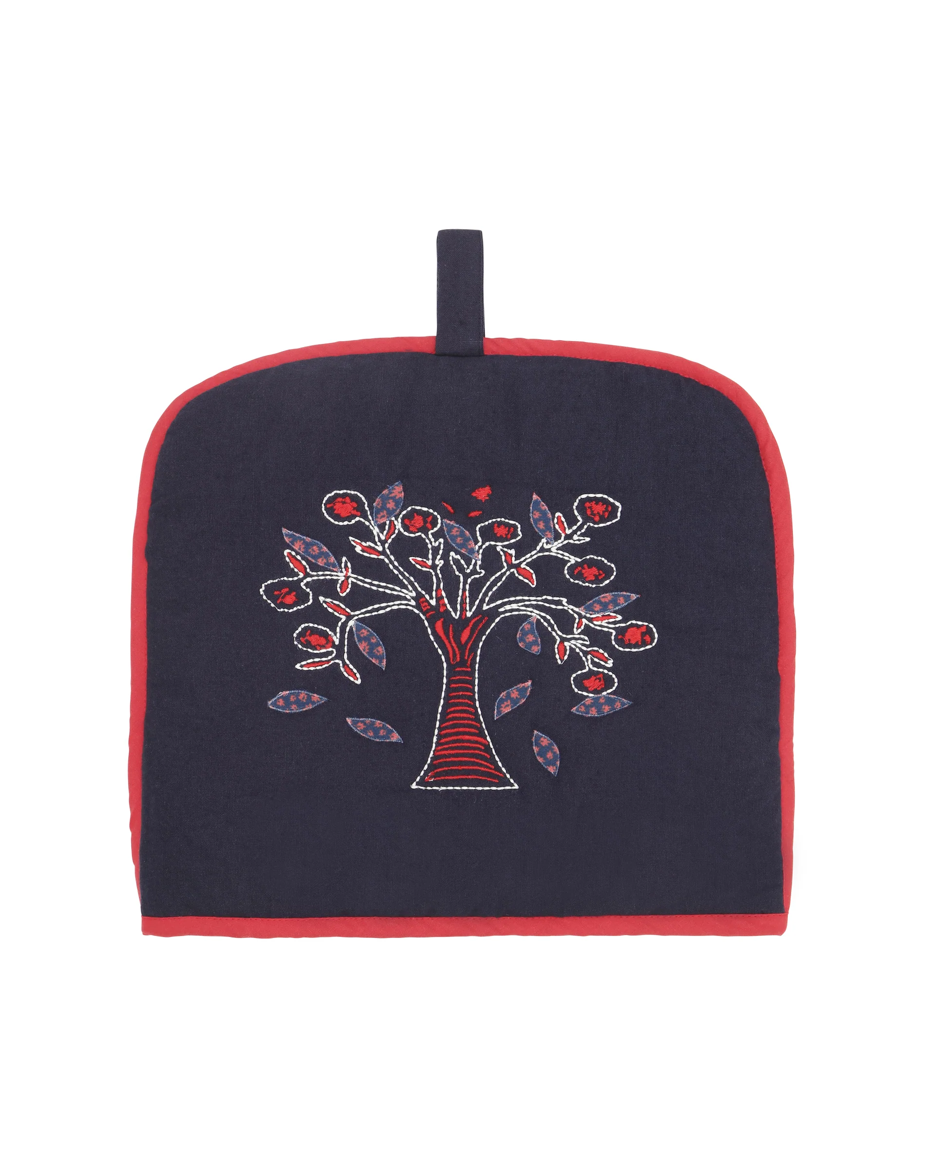 En dekorativ tehætte. Den er quiltet med det smukkeste broderede træ. Tevhætten er kantet med en rød kant.